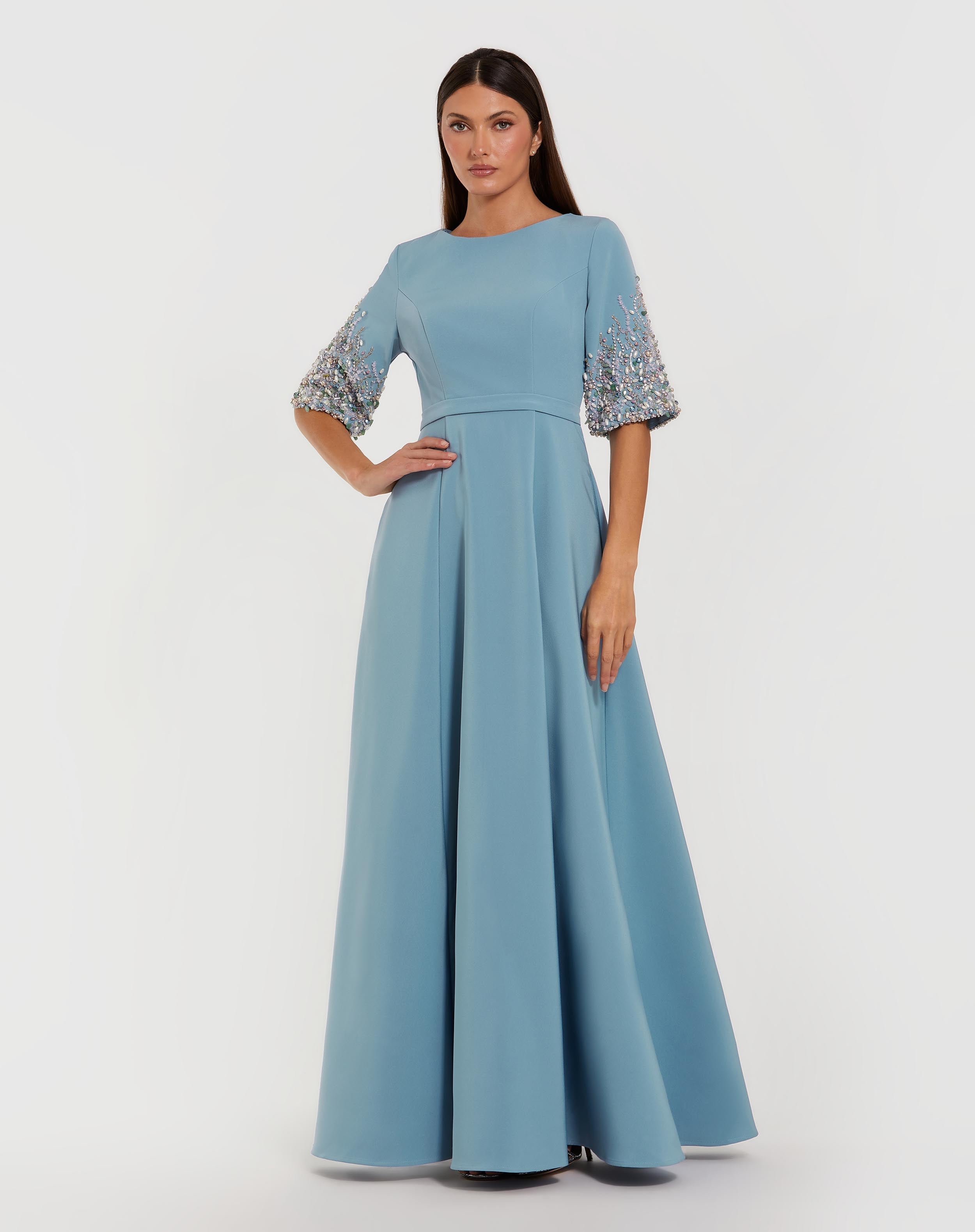 Blue Crepe Gown With Embellished 3/4 Sleeves