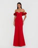 Turn heads in this off-the-shoulder gown, adorned with 3D floral appliqué and finished with a sleek flared silhouette; perfect for formal occasions.